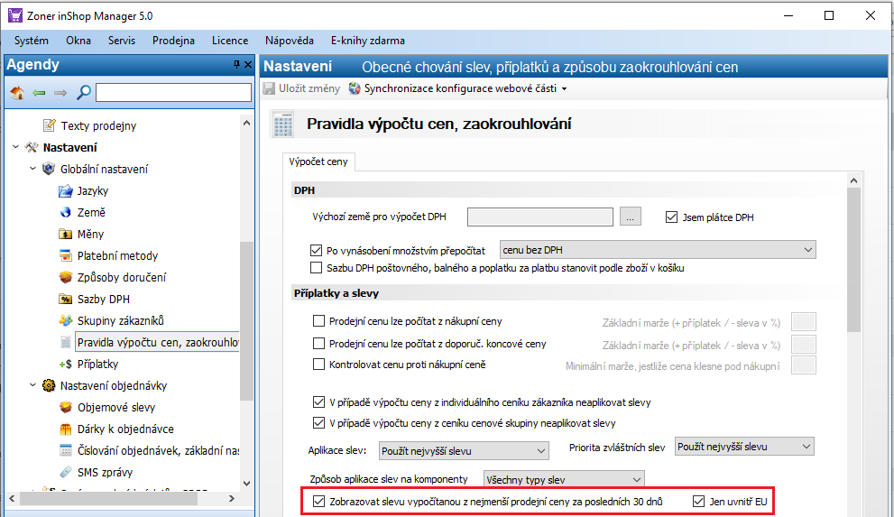 Legislativa nově stanovuje povinnost při prodeji zobrazovat výši slevy podle nejnižší prodejní ceny za posledních 30 dnů. Ve verzi 5.0.3 jsme tuto funkčnost doplnili.