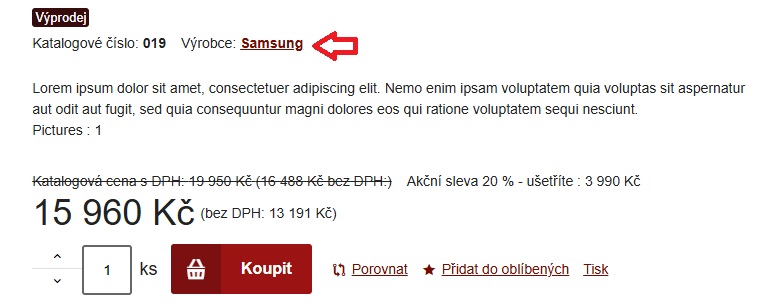 Pokud je popis vyplněný, tak na eshopu se název výrobce automaticky změní na odkaz, který po kliknutí vede na stránku o daném výrobci. Na této stránce se zobrazí informace, které máte zadané v Managerovi v poli Popis.