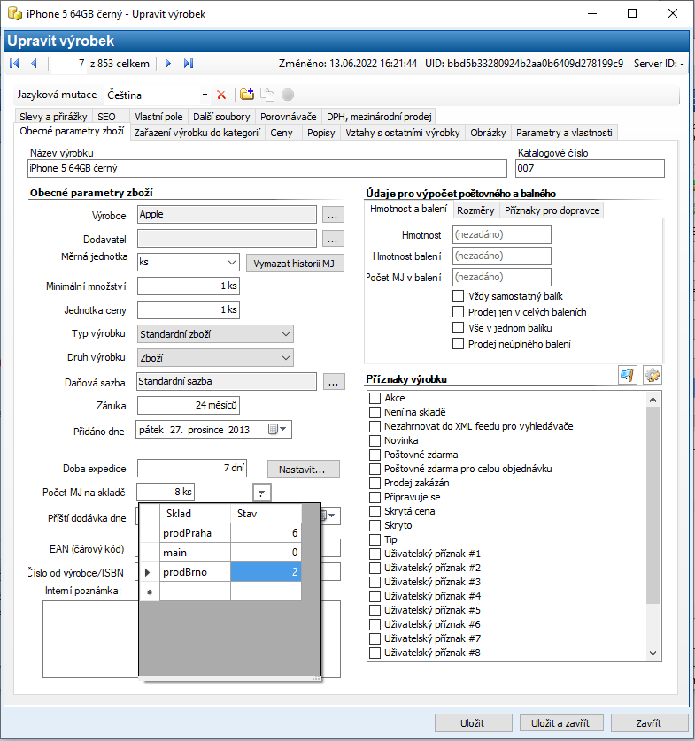 Na kartě produktu je možné stavy skladů zobrazit a editovat.