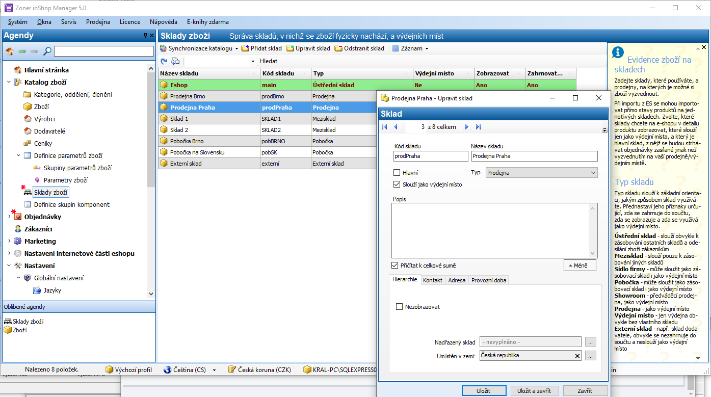 V Manageru přibyla agenda "Sklady zboží", kde je možné nadefinovat několik skladů. Je-li sklad označen jako výdejní místo, automaticky se bude nabízet v seznamu výdejních míst dopravy Vyzvednutí na pobočce a bude možné k němu zadat adresu, kontaktní údaje apod.